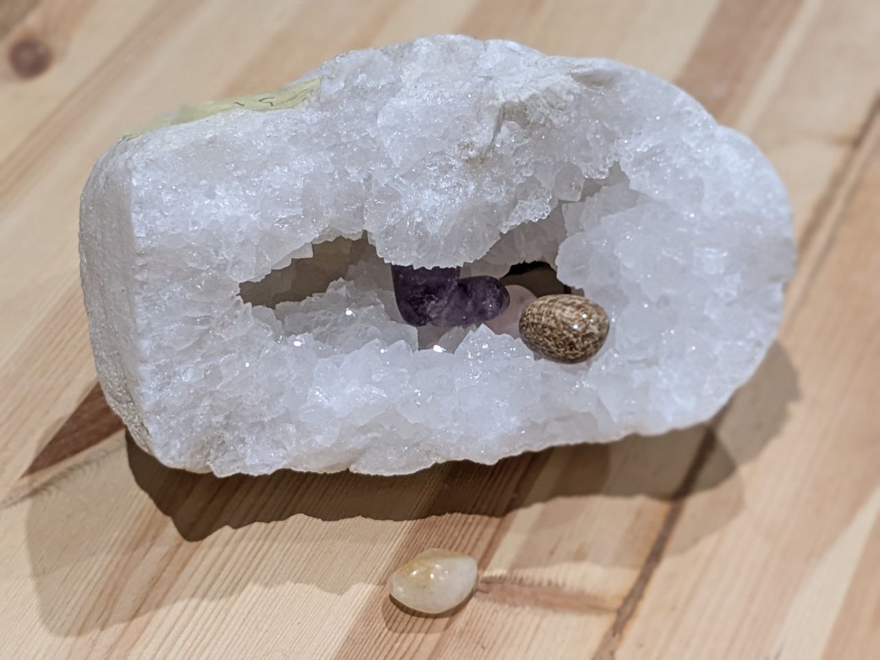 Diese besondere Quarzdruse hat eine wunderschöne Vertiefung, die eine tiefe Reinigung deiner Edelsteine ermöglicht. Mit ihren klaren großen Spitzen sieht sie nicht nur atemberaubend aus, sondern kann auch deine Edelsteine kraftvoll reinigen und ist zudem sehr klärend und strahlt sanft in den Raum.