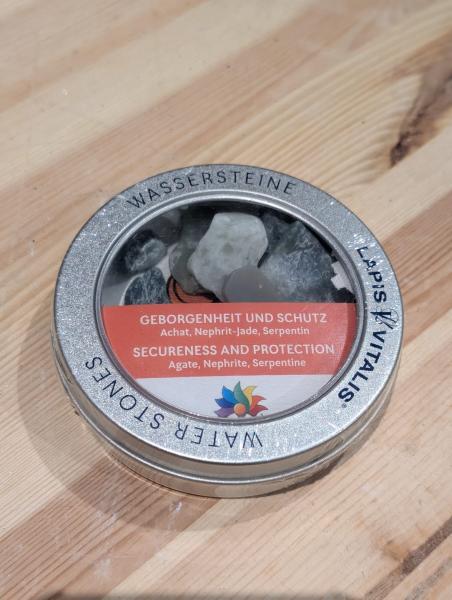 Diese Wassersteinmischung mit Nephrit-Jade, Achat und Serpentin hüllt uns ein in schützende Energie und schwingt wunderbar behütend.
